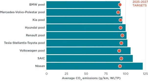Średnie emisje CO2 grup producentów i indywidualnych producentów w porównaniu z szacowanymi celami na lata 2025–2027, 2025 r.: