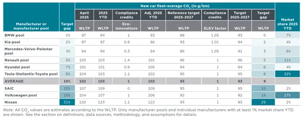 Pomimo rosnącej liczby pojazdów bezemisyjnych, europejscy producenci nadal mają problem z osiągnięciem docelowych poziomów emisji dwutlenku węgla. Średnia emisja CO₂ w kwietniu wyniosła 102 g/km, czyli o 9 g/km więcej niż cel na lata 2025–2027 (93 g/km przyp. red.).