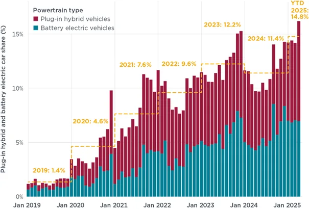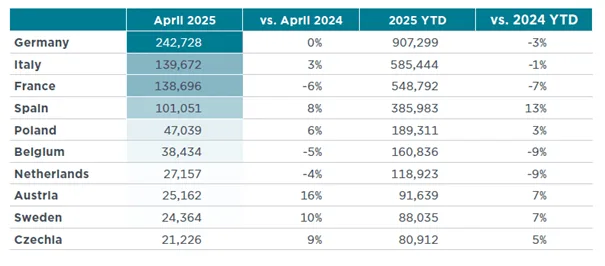 Największe przyrosty rejestracji BEV zanotowano w krajach Europy Środkowo-Wschodniej – we Włoszech (+110 proc.), Czechach (+109 proc.) i Polsce (+103 proc.). Niemcy – jako największy rynek motoryzacyjny Europy – również notują solidny wzrost: 54 proc. więcej zarejestrowanych BEV-ów niż rok wcześniej, co przekłada się na 45,5 tys. nowych pojazdów i 19 proc. udziału w rynku.