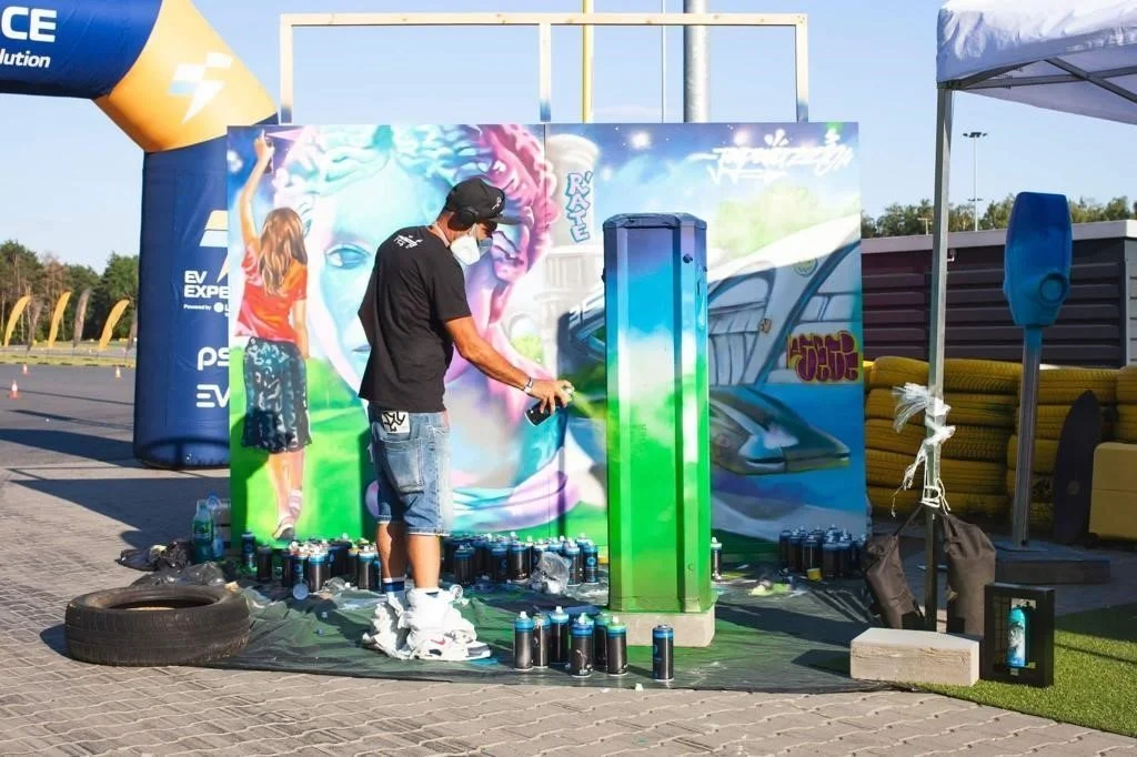 Dzięki wieloletniej znajomości z właścicielką galerii MAG- Anną Annomalią powstała koncepcja zaangażowania w projekt malowania stacji ładowania młodych artystów. Inauguracja projektu, a tym samym pierwsza, niepowtarzalna ładowarka została pomalowana na żywo podczas EV Experience na Torze Modlin pod koniec czerwca tego roku. Specjalnie na to wydarzenie przyleciał jeden z najbardziej znanych muralistów i graficiarzy – Paparazzi z Cypru. Artysta malował stację ładowania, ale też wielkie płótno, na którym przedstawi świat, w którym nie ma już samochodów spalinowych. Paparazzi w swojej artystycznej wizji nawiązał do tematów ekologii, czystego środowiska oraz dzieci, które są przyszłością i dla których z takim zaangażowaniem zmieniamy teraz świat.