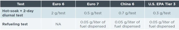 Tabela przedstawia porównanie norm emisji par w ramach norm Euro 6, amerykańskiej Agencji Ochrony Środowiska (EPA Tier 3), chińskiej normy 6b i proponowanych wartości granicznych normy Euro 7, które mają zastosowanie do pojazdów lekkich:
