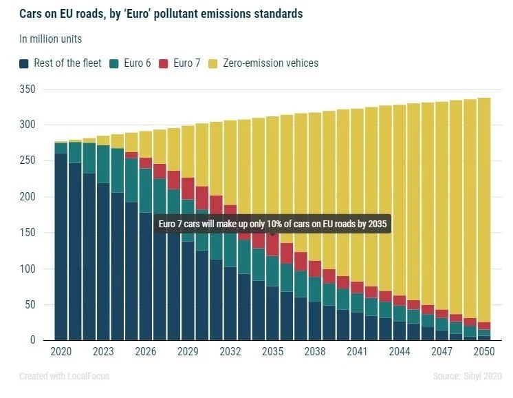 Oczekuje się, że na przełomie 2026/2027 wejdą w życie przepisy dla normy Euro 7 dotyczące emisji i sprzedaży nowych samochodów z silnikiem spalinowym w UE. W rezultacie samochody spełniające normę Euro 7 będą stanowić zaledwie 10% samochodów poruszających się po drogach UE w 2035 r. Zdaniem ACEA nie przełoży się to na realne korzyści, choćby w zakresie ograniczenia emisji. Niedawno przeprowadzone badanie przez ACEA wskazuje, że rezultatem będzie najwyżej 4% redukcja emisji tlenków azotu (NOx).