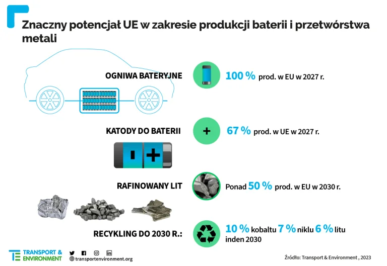 Prognozy T&E pokazują także, że możliwe jest znaczne obniżenie zależności od Chin w zakresie rafinacji i przetwarzania metali do baterii: do 2030 r. ponad 50% europejskiego zapotrzebowania na rafinowany lit może być zaspokajane z projektów realizowanych na starym kontynencie, w tym w RockTech Lithium i Vulcan Energy Resources w Niemczech oraz Imerys we Francji. Surowce miałyby być pozyskiwane z kopalń za granicą lub bezpośrednio z europejskich w ramach planowanej unijnej ustawy o surowcach krytycznych, pod warunkiem spełnienia surowych norm środowiskowych i socjalnych.