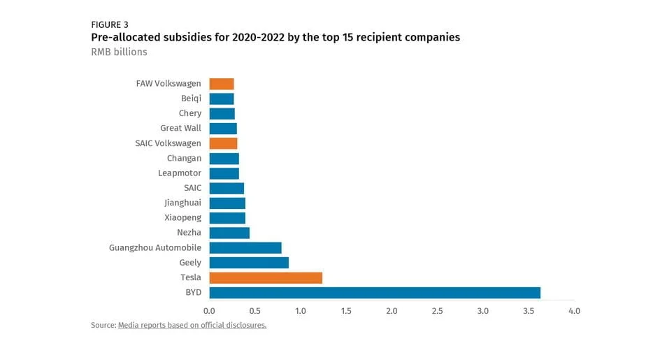 BYD, lider na chińskim rynku pojazdów elektrycznych (na światowym rynku ustępuje tylko Tesli przyp. aut.), odniósł znaczne korzyści z tego systemu dotacji. Jednak nie tylko krajowe firmy czerpią korzyści. Międzynarodowi giganci motoryzacyjni, tacy jak Tesla i Volkswagen, dzięki współpracy z chińskimi firmami SAIC i FAW, również znaleźli się w kręgu odbiorców analizowanych przez UE dotacji. W latach 2020–2022 Tesla zgromadziła dotacje o wartości 1,24 miliarda RMB (192 mln USD), podczas gdy spółki joint venture Volkswagena zgromadziły 0,58 miliarda RMB (79 mln USD).