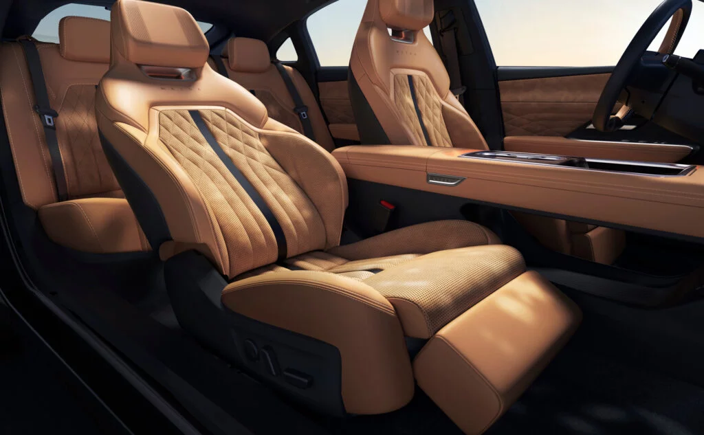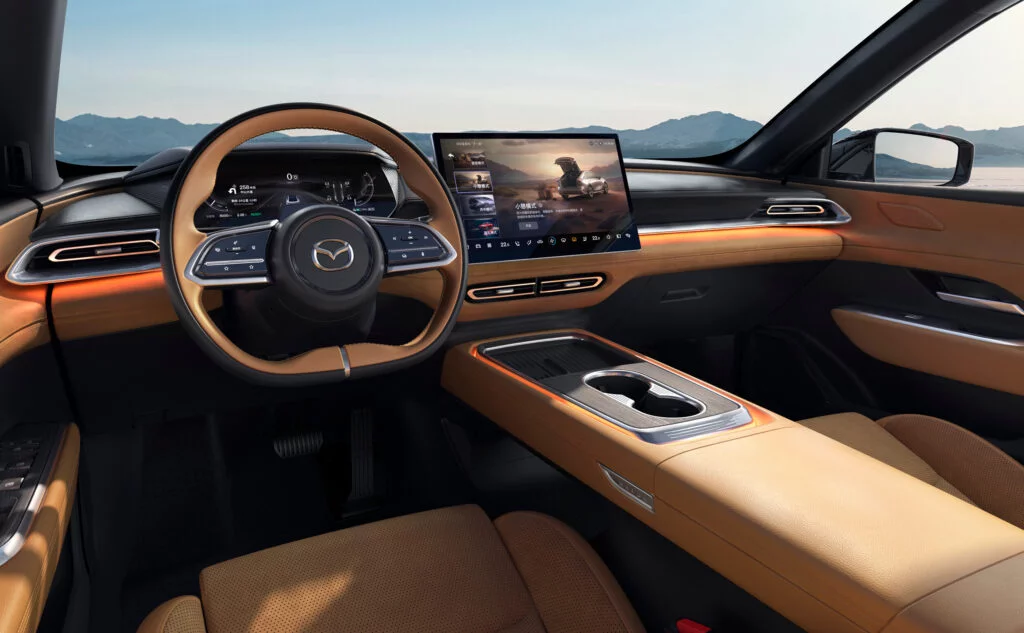 Mazda EZ-6 ma nieźle prezentujące się na zdjęciach wnętrze z „pożyczonymi” od SL03 elementami – w tym z ekranem dotykowym o przekątnej 14,6 cala. To największy wyświetlacz, jaki kiedykolwiek seryjnie zamontowano w aucie marki Mazda. Nie zabrakło także systemu audio Sony z 14 głośnikami i oświetlenia ambiente z 64 kolorami do wyboru.