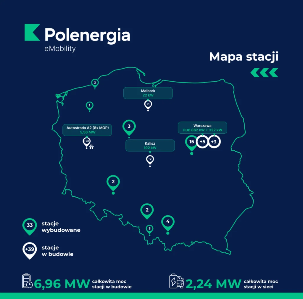 W sieci Polenergii pojawią się m.in. pierwsze ultraszybkie stacje o mocy 400 kW, wyposażone w kable chłodzone cieczą. Po oddaniu inwestycji do użytkowania firma będzie dysponowała liczbą ponad 70 stacji ładowania z planem budowy kilkudziesięciu kolejnych. Za rozbudowę sieci odpowiada należąca do grupy Polenergia eMobility. Budowa 39 stacji obejmuje huby stacji ładowania w wybranych centrach miast, a także przy ośmiu Miejscach Obsługi Podróżnych (MOP), które znajdują się na trasie Autostrady A2 (w obu kierunkach).