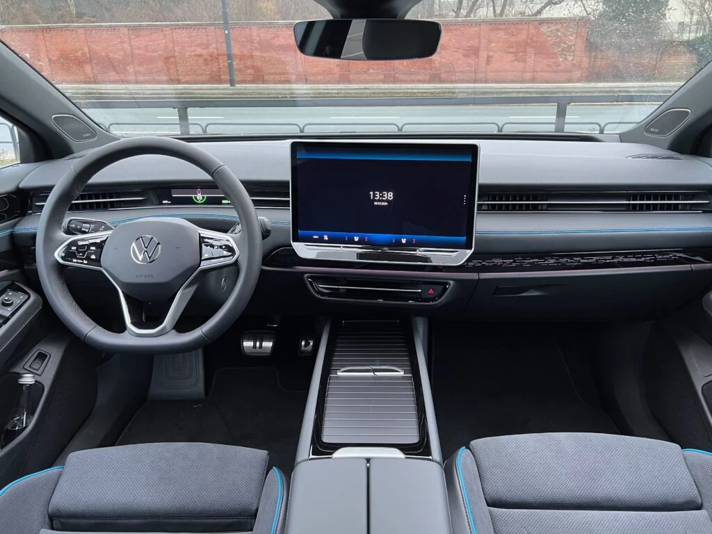 Wnętrze ID.7 jest – typowo dla obecnych produktów koncernu, a także większości nowych aut w ogóle – zdominowane przez duży ekran dotykowy. Ma aż 15 cali. W odróżnieniu od niektórych rywali, Volkswagen nie ma jednak równie dużego wyświetlacza za kierownicą, w miejscu zegarów. Jest wąski i nieduży, choć trudno uznać to za wadę. Nie odwraca uwagi i pokazuje się na nim to, co najistotniejsze. Uzupełnia go obecny w tym egzemplarzu wyświetlacz head-up z funkcją rozszerzonej rzeczywistości. Wyświetla np. linie na drodze.