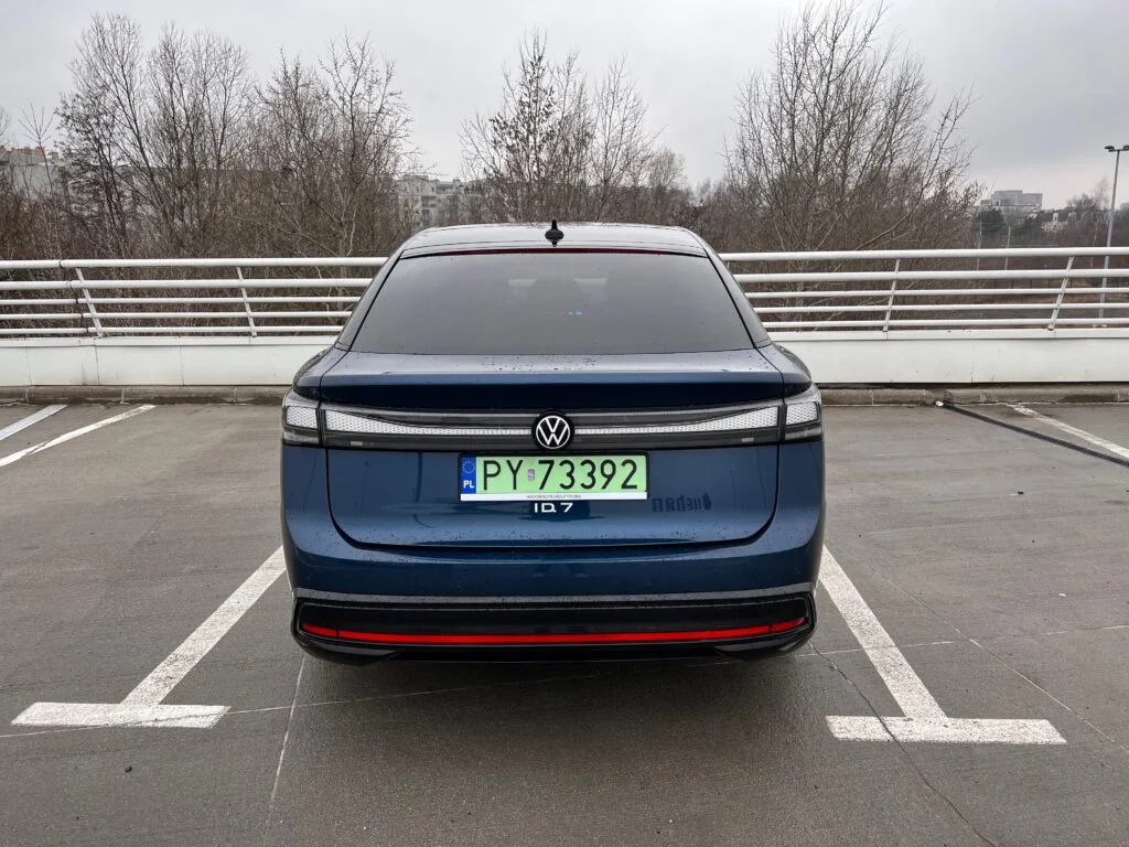 Jeśli chodzi o design – ID.7 stanowi idealną propozycję dla tych, którzy mają dość SUV-ów, albo z jakiegoś powodu nie chcą przekonać się do tego typu nadwozi. Jego wygląd jest utrzymany w podobnym stylu, co np. w ID.4 czy ID.5, ale ma – być może za sprawą dynamiczniejszych linii nadwozia – więcej „pazura”. Szczególnie dobre wrażenie robi tył z efektowną listwą świetlną. Z przodu uwagę zwraca dioda wyróżniająca auto po zmroku, biegnąca między dwoma reflektorami Matrix LED.