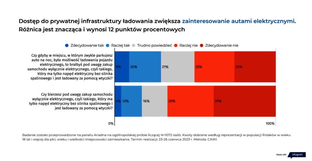 Dostęp do prywatnej infrastruktury ładowania zwiększa zainteresowanie autami elektrycznymi. Różnica jest znacząca i wynosi 12 p.p. Odsetek osób, które rozważają zakup „elektryka” rośnie z 17 do 29%, jeśli w miejscu parkowania auta w nocy byłaby możliwość ładowania pojazdu. Więcej jest także osób niezdecydowanych (+5 punktów procentowych) oraz mniej tych, którzy nie rozważają takiego zakupu (-17 p.p.). Te zmiany sugerują, że z punktu widzenia badanych dostęp do ładowarki stanowi argument wart zastanowienia, gdy mowa o rozważaniu zakupu auta elektrycznego.
