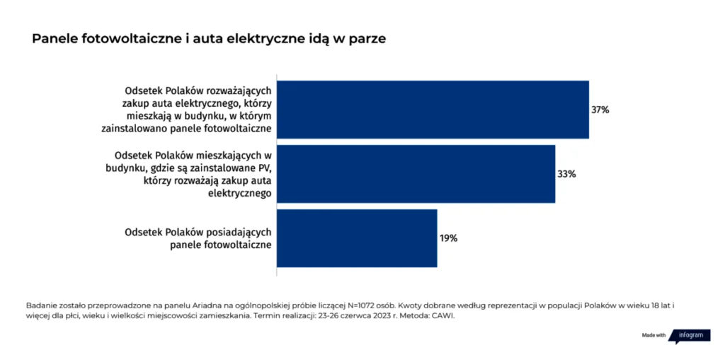 Co trzeci badany, który mieszka w budynku, gdzie są zainstalowane panele fotowoltaiczne, rozważa zakup auta elektrycznego. Wśród badanych, którzy mieszkają w budynku, gdzie nie ma fotowoltaiki, ten odsetek wynosi tylko 13%. Jeżeli spojrzymy zaś na grupę osób rozważających zakup auta elektrycznego to 37% z nich już teraz mieszka w budynku, w którym zainstalowano panele fotowoltaiczne.