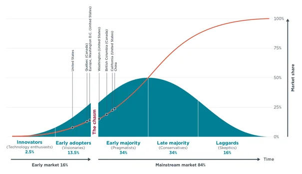 Adaptacja nowych technologii zwykle przebiega w kilku etapach, począwszy od ich przyjęcia przez „innowatorów”, a kończąc na „maruderach”, jak opisuje model adopcji technologii Everetta M. Rogersa. Samochody elektryczne (BEV) również przechodzą tę ścieżkę, którą znamy z innych innowacji, takich jak radio czy telewizja kablowa. Kluczowym etapem na tej drodze jest przełamanie tzw. „przepaści”, opisanej przez Geoffreya Moore’a, która oddziela wczesnych użytkowników technologii od większości konsumentów. W Europie obecnie znajdujemy się na etapie przekraczania tej „przepaści”, co sprawia, że polityki wspierające (rządowe) są kluczowe dla dalszego rozwoju rynku BEV.