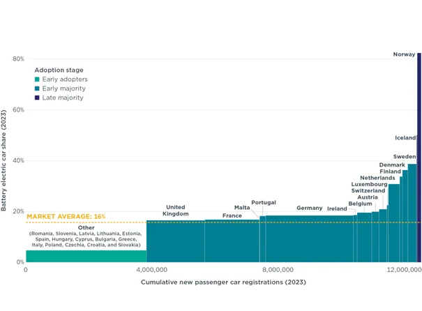 lustracja cyklu życia adaptacji technologii przedstawiająca nowe udziały rejestracyjne samochodów elektrycznych zasilanych akumulatorami dla trzech największych rynków samochodowych (Chiny, Europa, Stany Zjednoczone) i wybranych rynków regionalnych w 2023 r. (Europa obejmuje 27 państw członkowskich UE, Islandię, Norwegię, Szwajcarię i Zjednoczone Królestwo).