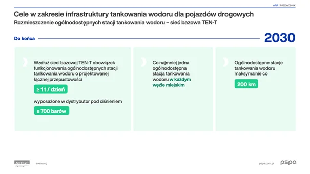 Rozwój sieci HRS napędzany jest przede wszystkim przez wchodzące w życie 13 kwietnia br. rozporządzenie AFIR (2023/1804), które stanowi kamień milowy w rozwoju infrastruktury paliw alternatywnych w całej Europie. Dokument zakłada rozwój sieci stacji dla pojazdów wodorowych wzdłuż głównych szlaków komunikacyjnych wchodzących w skład bazowej sieci TEN-T. Określa on maksymalną odległość między HRS, która nie może być większa niż 200 km oraz nakłada obwiązek zapewnienia minimalnej przepustowości H2 na poziomie 1 tony na dzień oraz standardu poziomu ciśnienia – 700 bar.
