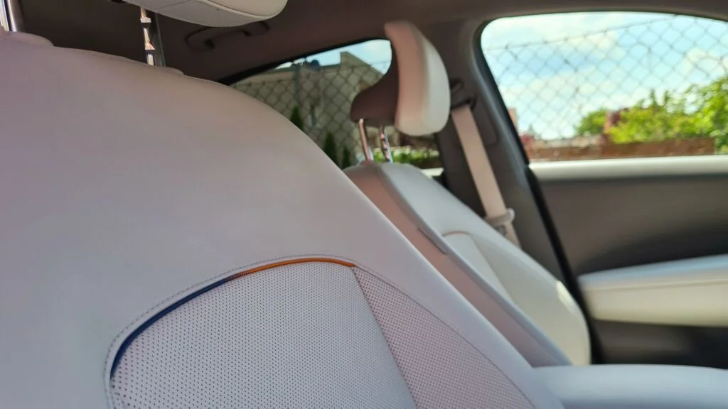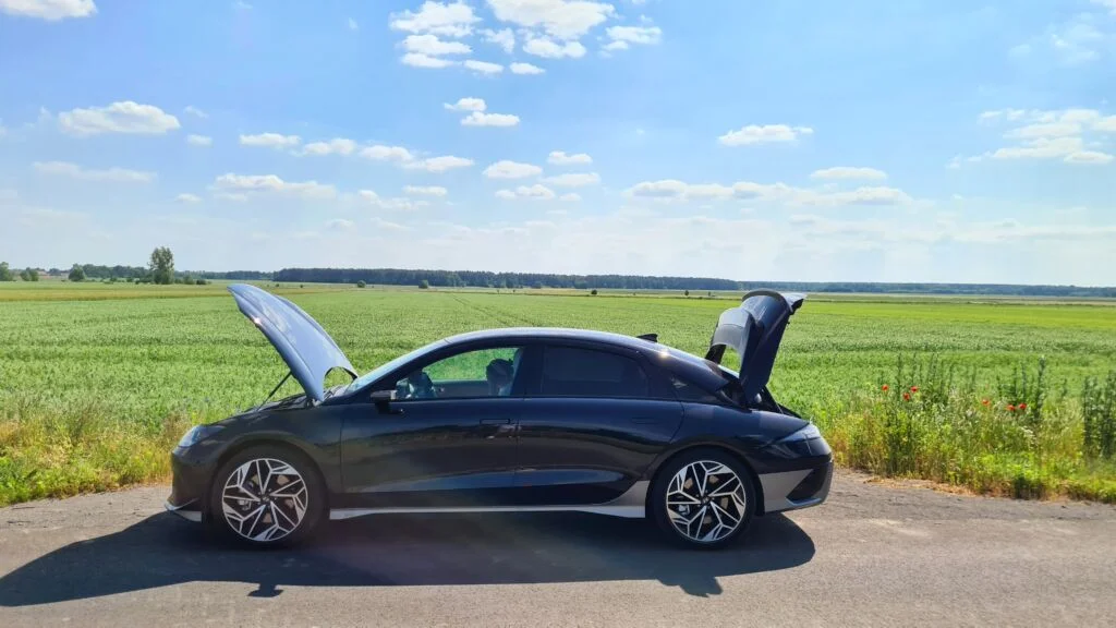 Ten nie porywa, 401 l pojemności jest wynikiem znacznie niższym niż u konkurencji jednak jest to cena aerodynamicznego designu i ostro schodzącej tylnej linii pojazdu. Na pocieszenie IONIQ oferuje frunk, którego nie znajdziemy np. w BMW i4. W wersji z dwoma silnikami i napędem na obie osie jego pojemność jest symboliczna i wynosi 14.5l jest to jednak w zupełności wystarczające, żeby zmieścić tam kable do ładowania. W przypadku wyboru wersji z napędem tylko na tył jego pojemność wzrasta do 44l.