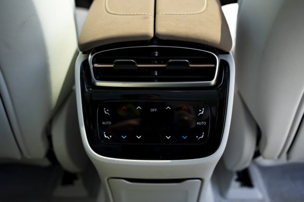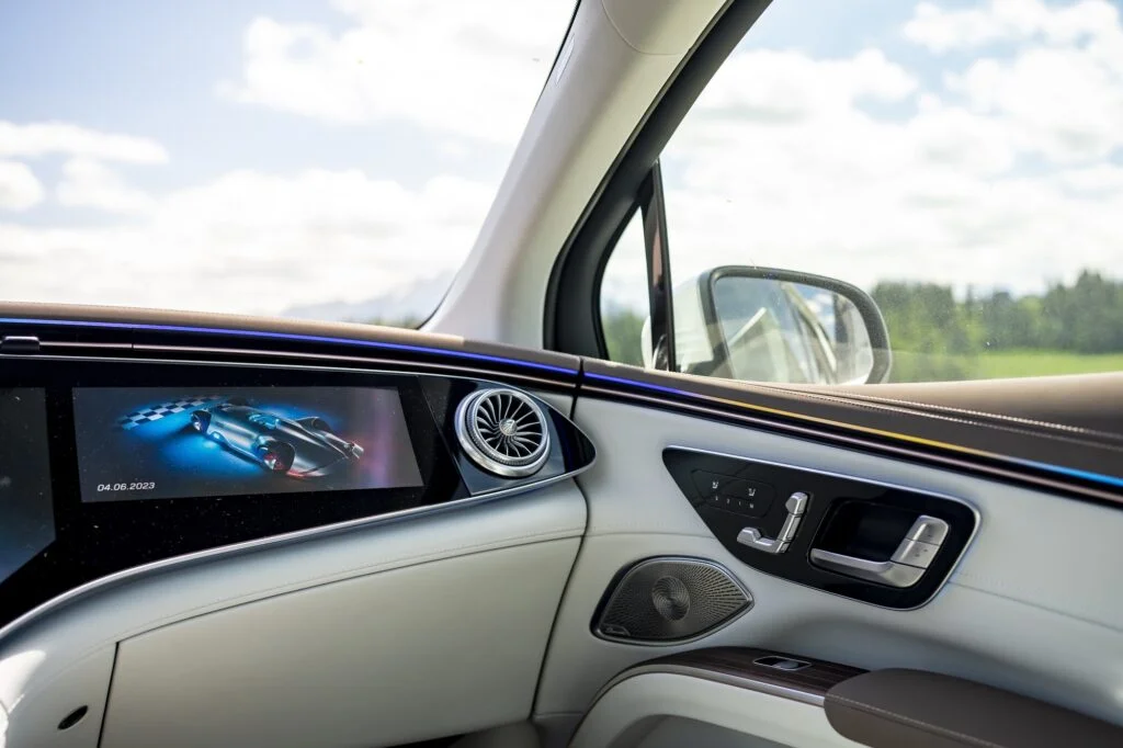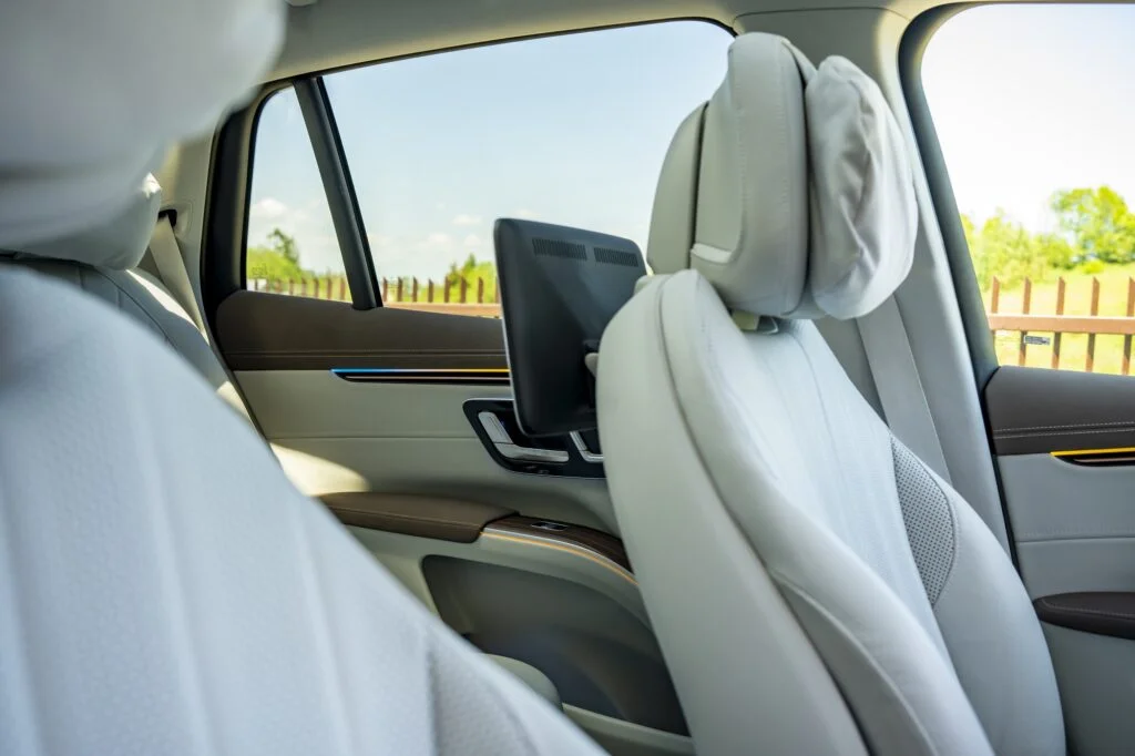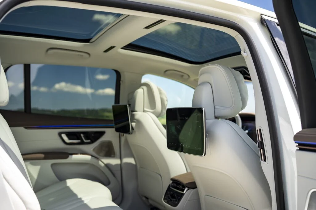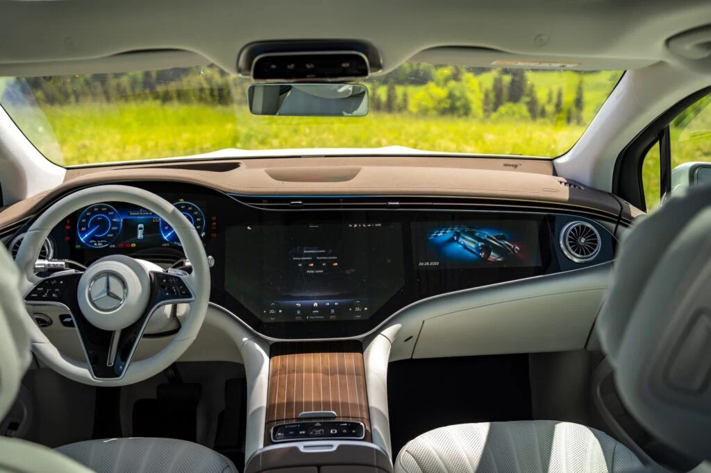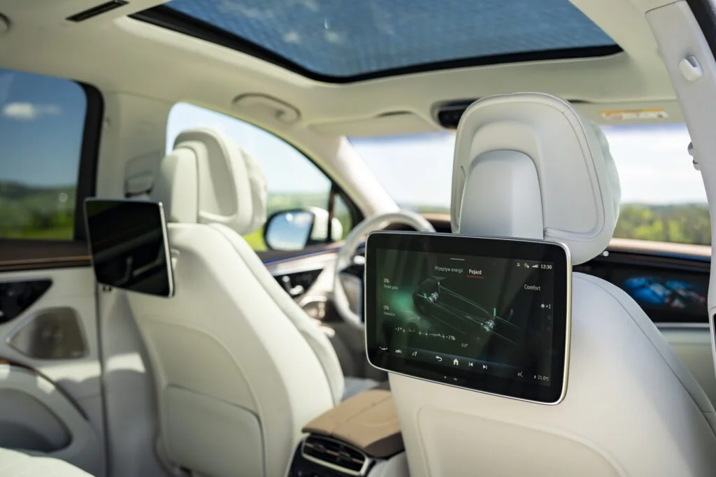 To co natomiast w EQS zachwyca to komfort. Fotele są ultraprestiżowe. Przednie można dowolnie ustawiać i cieszyć się takimi udogodnieniami jak masaż. Z tyłu natomiast jest prestiżowa kanapa z możliwością sterowania pochylenia oparcia (dzielone w dwóch częściach). Dodatkowo na każdym zagłówku zamocowane są prestiżowe poduszki, które zdecydowanie podnoszą komfort jazdy. Z tyłu dodatkowo rozrywkę zapewniają dwa ekrany, na których możemy odtwarzać różne rzeczy oraz zarządzać ustawieniami pojazdu.