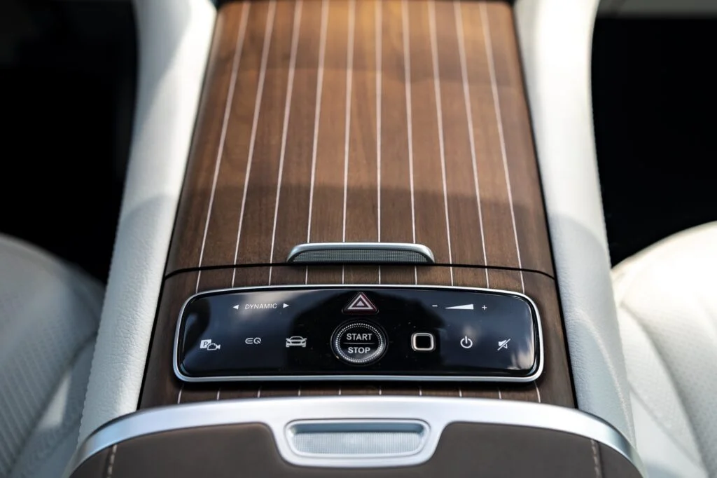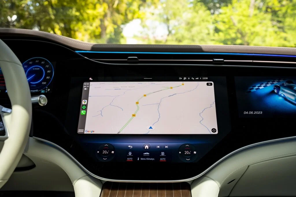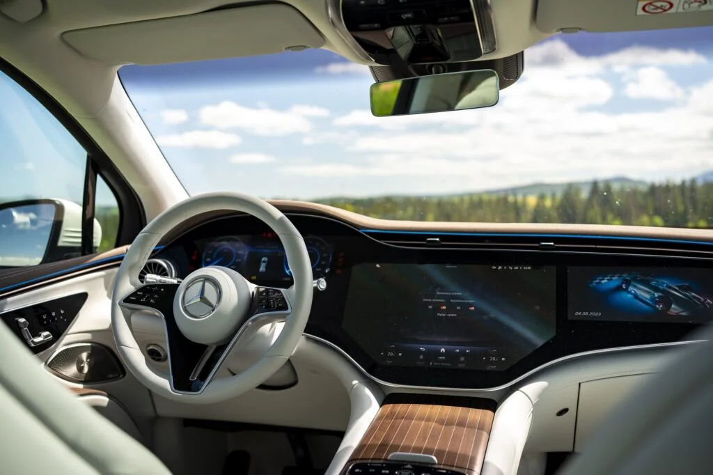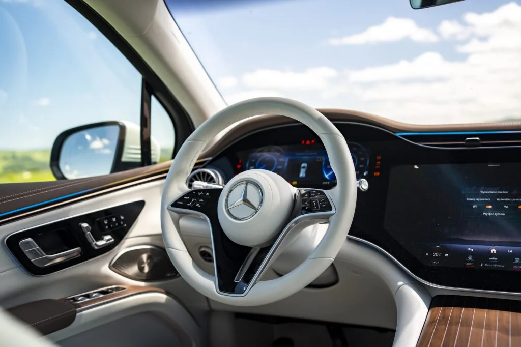 Mówiąc o Hyperscreen nie sposób pominąć kwestii jego obsługi. Choć soft jest o wiele bardziej intuicyjny w porównaniu do MBUX to spektrum ustawień jest tak szerokie, że najlepiej robić to podczas postoju. Na szczęście w Mercedesie przemyśleli kwestię obowiązkowego systemu ostrzegania o przekroczeniach prędkości. Można go wyłączyć za pośrednictwem jednego kliknięcia na ekranie. Kolejnym problemem jest jasność świecenia samego wyświetlacza. Jazda w nocy może być uciążliwa, gdyż nawet przy najmniejszym natężeniu jest w aucie zbyt jasno. Z kolei maniacy podświetlenia wnętrza będą zachwyceni możliwością wyboru z palety ponad 60 kolorów. Pozostając w temacie obsługi nadal nie mogę się przekonać do sterowania dotykowego na kierownicy. Według mnie nadal nie działa to idealnie i nigdy nie wiadomo, jak zareagują.