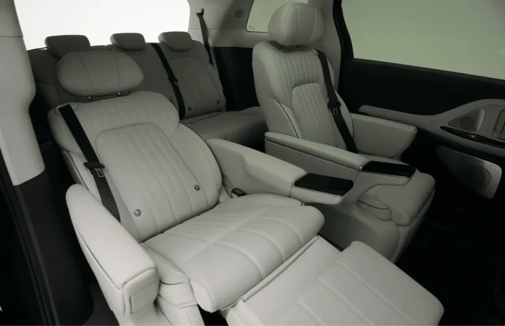 Auto w środku może oferować układ 2+2+3 lub 2+2. Ta druga opcja gwarantuje największą przestrzeń i wygodę, ale również w wersji siedmioosobowej zastosowano np. fotele z funkcją „zerowej grawitacji” i nowe funkcje podgrzewania, regulacji i wentylacji. Zamontowano także 6-calowe ekrany w podłokietnikach do sterowania funkcjami foteli i 17,3-calowy ekran sufitowy. Nie zabrakło 13-litrowej lodówki z funkcją ogrzewania.