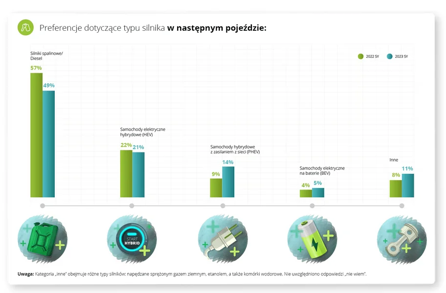 Hybrydy (HEV) niezmiennie zajmują drugą pozycję preferencji wyboru w Polsce (21%) i większości krajów świata. W przypadku Japonii zwolennicy tego rodzaju pojazdów stanowią taki sam odsetek co fani samochodów spalinowych (po 36%). Polscy konsumenci zdają się wpisywać w światowe trendy dotyczące hybryd z możliwością ładowania (PHEV) – w tym obszarze zanotowano wzrost preferencji z 9 do 14%. Zwolennicy w pełni elektrycznego napędu (BEV) stanowią najmniej liczną grupę polskich konsumentów, co stoi w kontrze do reszty badanych rynków. Szczególny kontrast widać na tle Chin, gdzie co trzeci ankietowany jako kolejny pojazd planuje kupić elektryka.