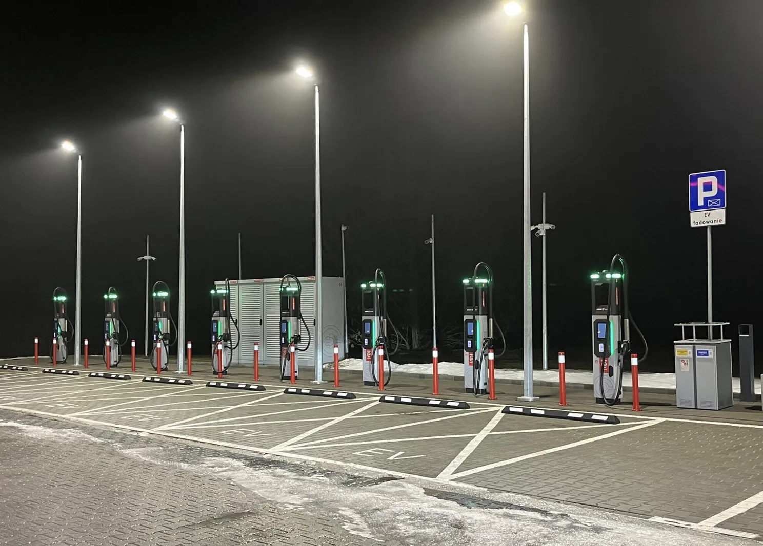 • 8 stanowisk do 400 kW w Brzegach – ORLEN uruchomił hub na trasie Warszawa-Kielce-Kraków z 8 słupkami (satelity Ekoenergetyka) o mocy 400 kW i 200 kW, przy stacji paliw z ORLEN Cafe, cena DC >125 kW: 3,19 zł/kWh, postój: 0,40 zł/min po 60 min od startu ładowania