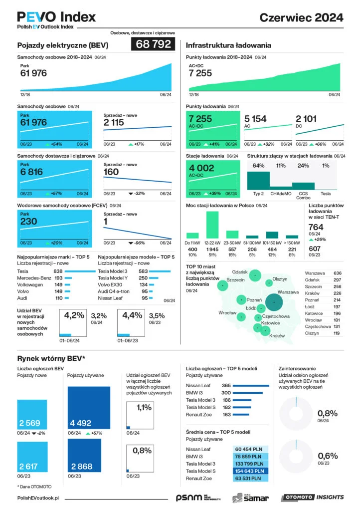 „PEVO Index” zawiera również dane na temat oferty na rynku wtórnym elektromobilności w Polsce. Pod koniec czerwca 2024 r. liczba ogłoszeń używanych BEV na portalu OTOMOTO wynosiła 4 492. To wzrost o 57% r/r. Udział ogłoszeń samochodów całkowicie elektrycznych w łącznej liczbie ogłoszeń pojazdów używanych to 1,1%. Takie oferty odpowiadały za 0,8% wszystkich odsłon ogłoszeń na portalu OTOMOTO. Najpopularniejszymi modelami BEV na wtórnym rynku e-mobility w Polsce były Nissan Leaf (365 ogłoszeń w czerwcu 2024 r. ze średnią ceną 60 454 PLN), BMW i3 (300 ogłoszeń ze średnią ceną 78 859 PLN) oraz Tesla Model 3 (186 ogłoszeń ze średnią ceną 133 799 PLN).