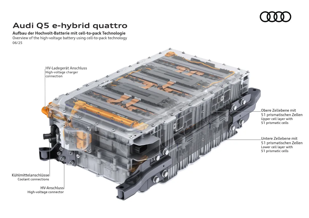 Producent z Ingolstadt podkreśla, że nowością jest akumulator wysokiego napięcia, którego ogniwa w Q5 e-hybrid są ułożone na dwóch poziomach, jeden na drugim (akumulator HV ma wymiary 517 × 880 × 302 milimetry). Maksymalna moc ładowania AC wynosi 11 kW. Naładowanie od 0 do 100 proc. zajmuje 2,5 godziny.