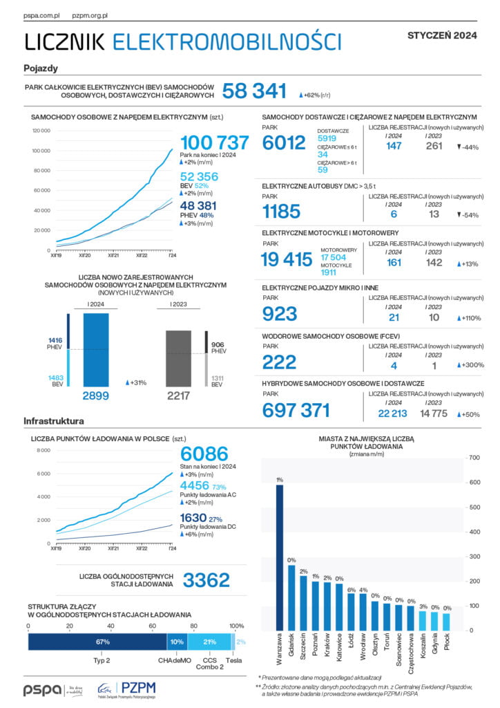 Pod koniec stycznia 2024 r. po polskich drogach jeździło 100 737 samochodów osobowych z napędem elektrycznym. Flota w pełni elektrycznych, osobowych aut (BEV, ang. battery electric vehicles) liczyła 52 356 szt., a park hybryd typu plug-in (PHEV, ang. plug-in hybrid electric vehicles) – 48 381 szt. Liczba samochodów dostawczych i ciężarowych z napędem elektrycznym wynosiła 6 012 szt. Stale rośnie też flota elektrycznych motorowerów i motocykli, która na koniec stycznia składała się z 19 415 szt., jak również liczba osobowych i dostawczych aut hybrydowych, która powiększyła się do 697 371 szt. Pod koniec ubiegłego roku park autobusów elektrycznych w Polsce wzrósł do 1185 szt.