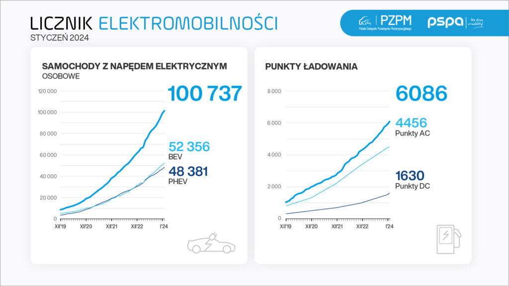 Równolegle do floty pojazdów z napędem elektrycznym rozwija się również infrastruktura ładowania. Pod koniec stycznia 2024 r. w Polsce funkcjonowało 6086 ogólnodostępnych punktów ładowania pojazdów elektrycznych (3362 stacje). 27% z nich stanowiły szybkie punkty ładowania prądem stałym (DC), a 63% – wolne punkty prądu przemiennego (AC) o mocy mniejszej lub równej 22 kW. W styczniu uruchomiono 153 nowe punkty.