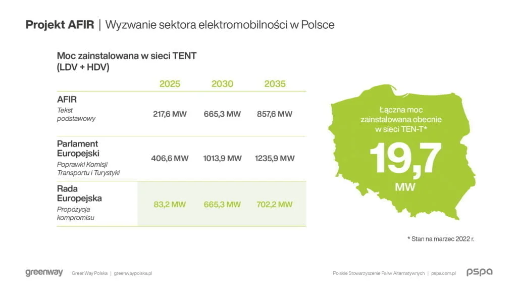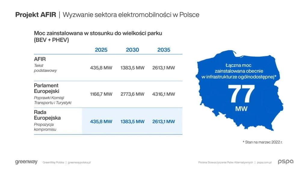 Przyspieszenie rozwoju sieci ładowania przyniesie przygotowywane przez instytucje Unii Europejskiej rozporządzenie AFIR (Regulation of the European Parliment and of the Council on the deployment of alternative fuels infrastructure), które zastąpi obowiązującą obecnie dyrektywę Parlamentu Europejskiego i Rady 2014/94/UE z dnia 22 października 2014 r. w sprawie rozwoju infrastruktury paliw alternatywnych, stanowiące część pakietu „Fit for 55”. Projekt AFIR wyznacza konkretne cele w zakresie infrastruktury, m.in. wprowadzając wymóg podnoszenia łącznej mocy ogólnodostępnych w zależności od liczby nowo rejestrowanych samochodów z napędem elektrycznym.