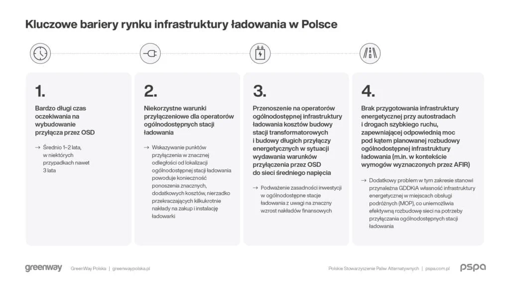 Podczas Kongresu Nowej Mobilności, największego wydarzenia branży e-mobility w regionie Środkowo-Wschodniej Europy zdefiniowano szereg barier systemowych ograniczających tempo rozwoju infrastruktury ładowania pojazdów elektrycznych. Należą do nich przede wszystkim przewlekłe i utrudnione procedury przyłączania stacji ładowania do sieci operatorów systemu dystrybucyjnego (OSD), wiążące się m.in. z bardzo długim czasem oczekiwania na wybudowanie przyłącza. W praktyce, w zależności od konkretnego przypadku, przedmiotowy proces trwa od 3 miesięcy do nawet 3 lat. Średnia mieści się w przedziale od 18 do 24 miesięcy (w segmencie DC). Przeszkodę stanowią również niekorzystne warunki przyłączeniowe, wiążące się ze wskazywaniem punktów przyłączenia w znacznej odległości od planowanych lokalizacji stacji. Powoduje to konieczność ponoszenia przez operatorów znacznych, dodatkowych kosztów, nierzadko przekraczających kilkukrotnie nakłady na zakup i instalację ładowarek. Ponadto, w sytuacji wydawania warunków przyłączenia przez OSD do sieci średniego napięcia, na operatorów przenoszone są koszty budowy stacji transformatorowych i budowy długich przyłączy energetycznych, co często podważa zasadność inwestycji w stacje ładowania z uwagi na znaczny wzrost nakładów finansowych. Często spotykaną sytuacją jest również brak przygotowania przy autostradach i drogach szybkiego ruchu infrastruktury energetycznej, która byłaby w stanie zapewnić odpowiednią moc pod kątem planowanej rozbudowy ogólnodostępnej infrastruktury ładowania (m.in. w kontekście wymogów wyznaczonych przez będący w przygotowaniu AFIR). Dodatkowy problem w tym zakresie stanowi przynależna GDDKiA własność infrastruktury energetycznej w miejscach obsługi podróżnych (MOP), co uniemożliwia efektywną rozbudowę sieci na potrzeby przyłączania ogólnodostępnych stacji ładowania.