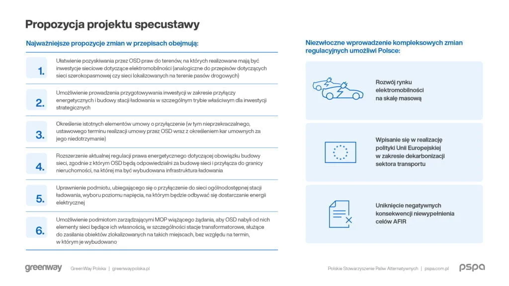 Wychodząc naprzeciw rynkowym wyzwaniom sektora infrastruktury ładowania, Polskie Stowarzyszenia Paliw Alternatywnych wraz z kluczowymi partnerami branżowymi opracowało propozycję projektu specustawy zawierającą postulaty rozwiązań regulacyjnych znoszących największe bariery opóźniające rozbudowę sieci ogólnodostępnych stacji ładowania w Polsce. Główne jej cele zakładają istotne skrócenie czasu realizacji budowy przyłączy ogólnodostępnych stacji ładowania do sieci OSD, które nie powinien przekraczać 12 miesięcy, bez względu na poziom napięcia, jak też wdrożenie mechanizmów ułatwiających i stymulujących OSD do inwestycji w rozbudowę sieci dystrybucyjnych celem przygotowania jej do przyłączania w przyszłości infrastruktury ładowania na skale masową. Dotyczy to szczególnie terenów, gdzie sieć dystrybucyjna jest słabo rozwinięta. Ponadto branża chce określenia precyzyjnie zdefiniowanych standardów budowy przyłączy przez OSD (m.in. w zakresie miejsca budowy punktu przyłączeniowego lub możliwości wyboru poziomu napięcia, niezależnie od mocy stacji ładowania) ułatwiających rozbudowę infrastruktury ładowania oraz uporządkowania struktury własnościowej infrastruktury energetycznej znajdującej się w Miejscach Obsługi Podróżnych.