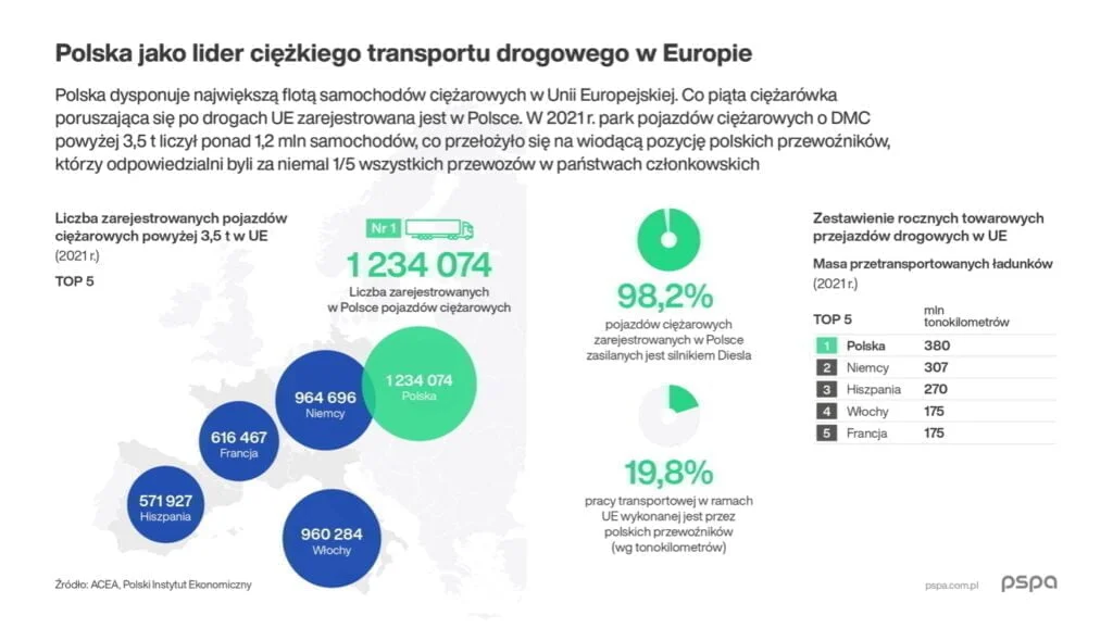 Polska spedycja dla UE jest wyjątkowo ważna. Jak wskazuje raport „Transport drogowy w Polsce 2021+”, niemal połowa towarów między Niemcami a Wielką Brytanią przewożona jest pojazdami zarejestrowanymi w Polsce. Duży udział jest również na trasach z Niemiec do Belgii, Włoch i Czech.