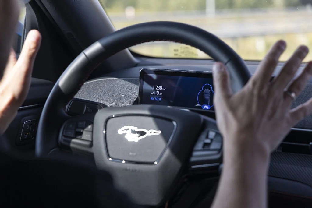 Wsiadam za kierownicę Mustanga Mach-E i wyjeżdżam na autostradę A2. Kilkanaście sekund po opuszczeniu pasa rozbiegowego i włączeniu się do ruchu na ekranie wirtualnych zegarów pojawia się informacja o gotowości funkcji BlueCruise – system musi najpierw sprawdzić, czy na pewno znajduje się na autostradzie, widoczne są oznaczenia pasów ruchu i czy kierowca patrzy na drogę. Naciskam niepozorny guzik na lewym ramieniu kierownicy, na zegarach pojawia się duża ikona niebieskiej kierownicy i… mogę już zdjąć ręce z kierownicy.