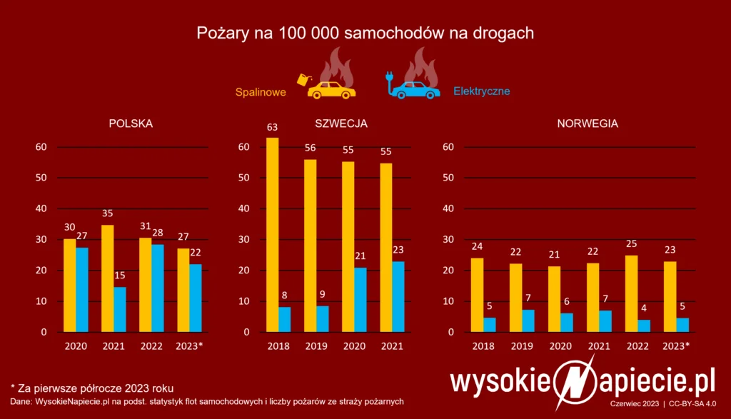 • W Polsce, na 100 000 zarejestrowanych samochodów, średnio pali się ok. 20 aut elektrycznych i 30 aut spalinowych