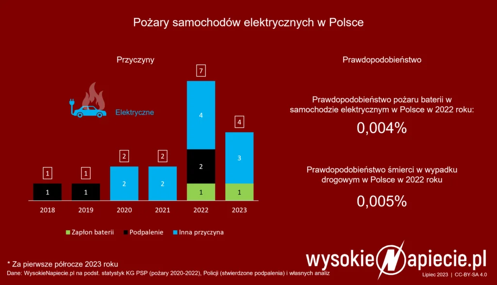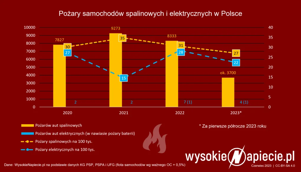 W 2022 roku polska straż pożarna odnotowała 7 pożarów samochodów elektrycznych (w tym 2 podpalenia) i 8333 pożarów samochodów spalinowych. W poprzednich dwóch latach paliły się po 2 auta elektryczne (w tym połowa to podpalenia) i 7-9 tys. aut spalinowych. Jeżeli jednak przeliczymy pożary na 100 tys. samochodów, liczby będą zbliżone – po 18-28 pożarów elektryków i 27-35 pożarów spalinówek.