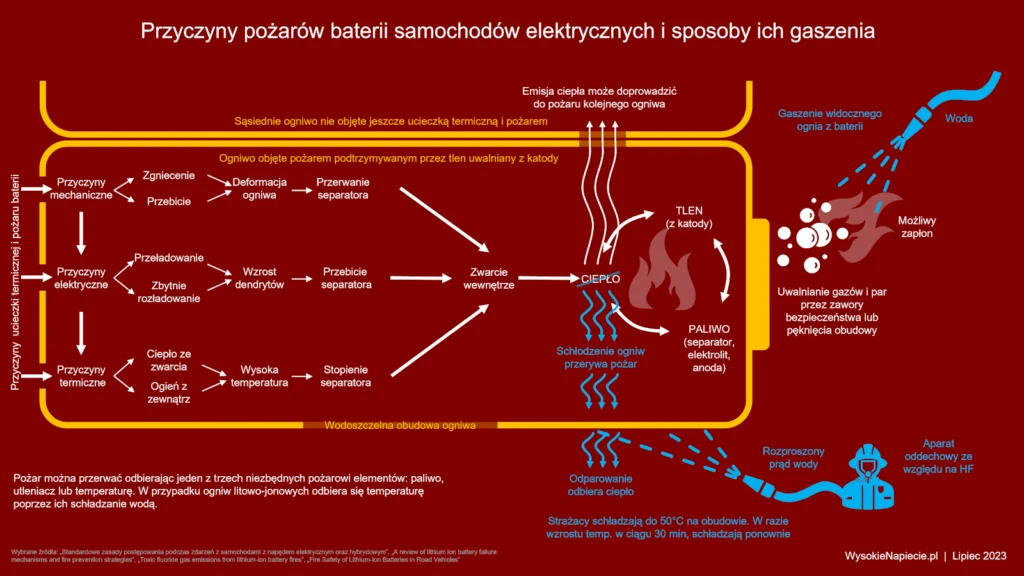 Jak już pisaliśmy, w zaledwie 20% pożarów samochodów elektrycznych przyczyną jest bateria trakcyjna, a w kolejnych 10% bateria zajmuje się w efekcie pożaru auta lub ognia z zewnątrz. Całe te 30% sprowadza się do tego, że ilość ciepła generowana w ogniwach lub dostarczanego do ogniw przewyższa przez dłuższy czas ilość ciepła oddawanego z powrotem na zewnątrz.