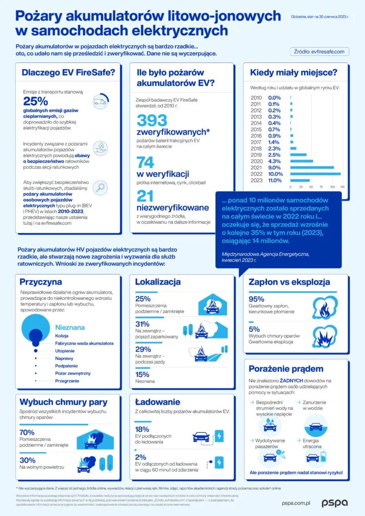 Ogień występuje rzadko, również, gdy porównujemy częstotliwość pożarów z tą znaną z wydarzeń z udziałem aut spalinowych. Może być niebezpieczny, ale o wiele mniej niż głosi obiegowa opinia. Pożary rzadko są spowodowane przez samozapłon, rzadko mają miejsce podczas ładowania, a służby gaśnicze nie zostają porażone prądem nawet podczas lania wody bezpośrednio na zestawy akumulatorów trakcyjnych. Duża część medialnych doniesień jest niezweryfikowana lub przesadzona. Po lekturze i analizie danych nasuwa się jeden wniosek: kwestia pożarów samochodów elektrycznych nie powinna i nie może być przeszkodą na drodze rozwoju elektromobilności.