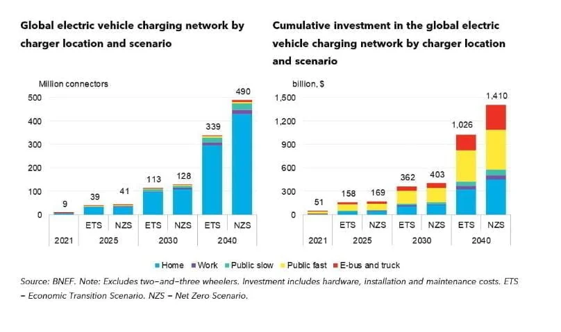 Do tego czasu potrzebnych będzie od 340 do 490 milionów ładowarek w lokalizacjach na całym świecie. Przy czym w większości będą to ładowarki domowe. W zależności od przyjętego scenariusza ładowarki usytuowane poza gospodarstwami domowymi będą stanowiły od 42 do 59 milionów sztuk do 2040 r.
