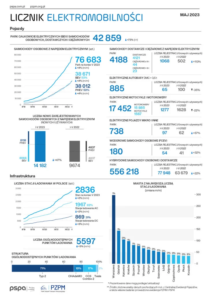 Pod koniec maja 2023 r. po polskich drogach jeździły 76 683 samochody osobowe z napędem elektrycznym. Flota w pełni elektrycznych aut (BEV, ang. battery electric vehicles) liczyła 38 671 szt., a park hybryd typu plug-in (PHEV, ang. plug-in hybrid electric vehicles) – 38 012 szt. Liczba samochodów dostawczych i ciężarowych z napędem elektrycznym wynosiła 4 188 szt., z czego BEV stanowiły ponad 99%. Stale rośnie też flota elektrycznych motorowerów i motocykli, która na koniec maja składała się z 17 452 szt., jak również liczba osobowych i dostawczych aut hybrydowych, która powiększyła się do 556 218 szt. Pod koniec ubiegłego miesiąca park autobusów elektrycznych w Polsce wzrósł do 885 szt.
