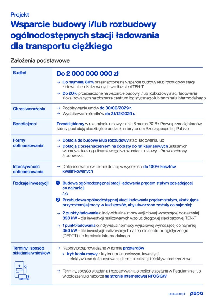 NFOŚiGW rozpoczął 31 stycznia 2024 roku konsultacje projektu programu priorytetowego „Wsparcie budowy i/lub rozbudowy ogólnodostępnych stacji ładowania dla transportu ciężkiego”. Nastąpiło to niecały tydzień po ogłoszeniu projektu innego programu, zakładającego dopłaty do zeroemisyjnych samochodów ciężkich kategorii N2 oraz N3. Na wsparcie rozbudowy infrastruktury ładowania dla eHDV NFOŚiGW zamierza zarezerwować 2 mld zł – dwukrotnie więcej niż na subsydia do elektrycznych ciężarówek. 80% tej kwoty tej kwoty zostanie przeznaczone na dotacje do ładowarek zlokalizowanych wzdłuż sieci bazowej TEN-T, zaś 20% – na dopłaty do stacji uruchamianych na obszarze centrum logistycznego lub terminalu intermodalnego. Nowy program będzie realizowany w latach 2024-2029. Co istotne, nabory mają być prowadzone w trybie konkursowym (a nie w ramach – budzącej kontrowersje – zasady pierwszeństwa wniosków, która obowiązywała m.in. w programie dopłat do infrastruktury dla samochodów osobowych). Projektowany regulamin przewiduje punktowe kryteria jakościowe takie jak efektywność dofinansowania, termin realizacji i efektywność rzeczowa.