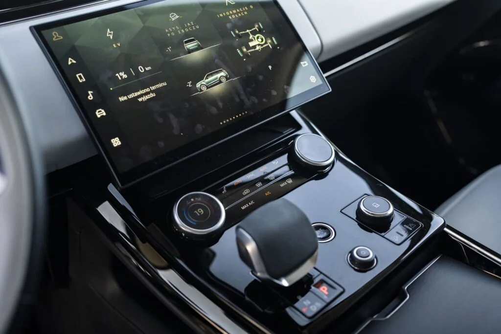 Mówiąc o układzie hybrydowym warto zaznaczyć, że w tym przypadku mamy dosłownie gigantyczną baterię o pojemności 38,2 kWh brutto (31,8 kWh netto). Jest to pojemność, która jeszcze niedawno była oferowana w pojazdach w pełni elektrycznych. W efekcie dzięki temu układowi (silnik elektryczny połączony ze skrzynią biegów o mocy 143 KM) możliwe jest pokonanie wyłącznie na energii elektrycznej ponad 100 km (według testu WLTP nawet 114 km) z prędkością do 140 km/h. Podczas prób testowych najlepszy rezultat jaki osiągnąłem to 94 km, co według mnie jest przyzwoitym wynikiem. Cieszy też ładowanie. W Range Roverze Sport mamy złącze DC, dzięki czemu możemy ładować akumulator z mocą nawet 50 kW. To znacząco przyspiesza cały proces i powoduje, że auto może być gotowe na przejechanie bez użycia silnika spalinowego w ciągu 30-40 minut.