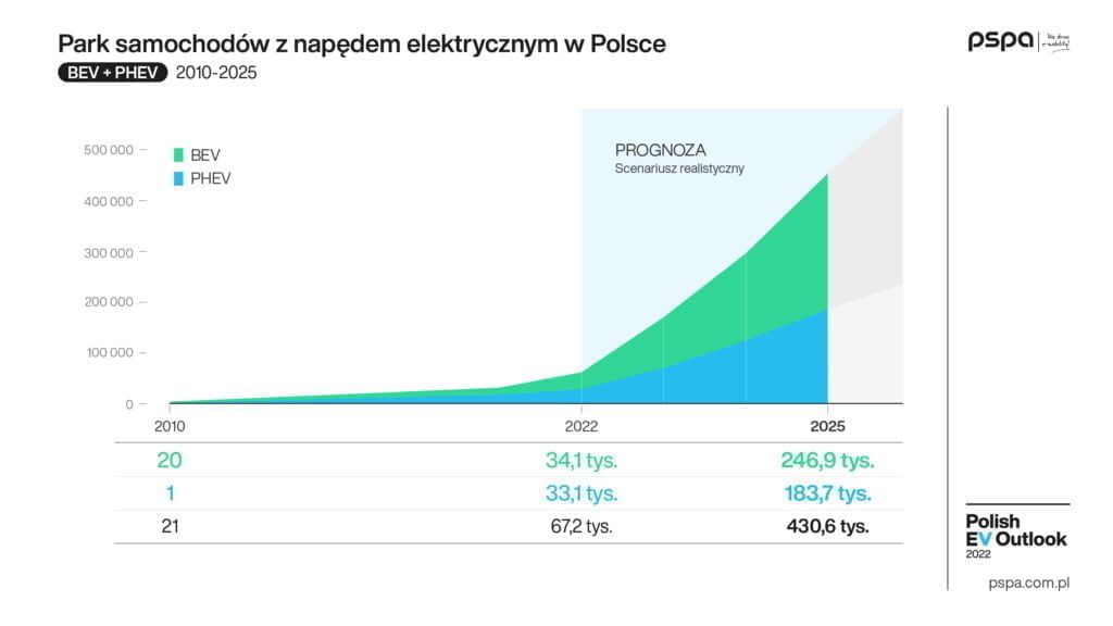 – Rok 2022 jest kolejnym już z rzędu rokiem pełnym wyzwań. Prognozy ujęte w „Polish EV Outlook” uwzględniają skutki wojny w Ukrainie, zaburzeń światowych łańcuchów dostaw, rosnące ceny kluczowych surowców, galopującą inflację oraz ryzyko powrotu pandemii COVID-19. W tych specyficznych warunkach elektromobilność w Polsce radzi sobie jednak nadspodziewanie dobrze. Sprzedaż EV w ciągu zaledwie 6 pierwszych miesięcy 2022 r. okazała się być wyższa niż cały park takich pojazdów pod koniec roku 2019. Spodziewamy się, że do 2025 r. udział samochodów całkowicie elektrycznych na rynku nowych pojazdów osobowych zwiększy się ponad sześciokrotnie od chwili obecnej i osiągnie poziom 14,5%. Jednocześnie łączna liczba BEV i PHEV jeżdżących po polskich drogach wzrośnie do ponad 430 tys., natomiast liczba nowych rejestracji do ponad 100 tys. W najbliższych miesiącach – z uwagi na trudną sytuację geopolityczną i gospodarczą – rynek elektromobilności będzie się jednak rozwijał wolniej niż przewidywały prognozy ujęte w poprzednich wydaniach „Polish EV Outlook” – powiedział Maciej Mazur, Dyrektor Zarządzający PSPA.