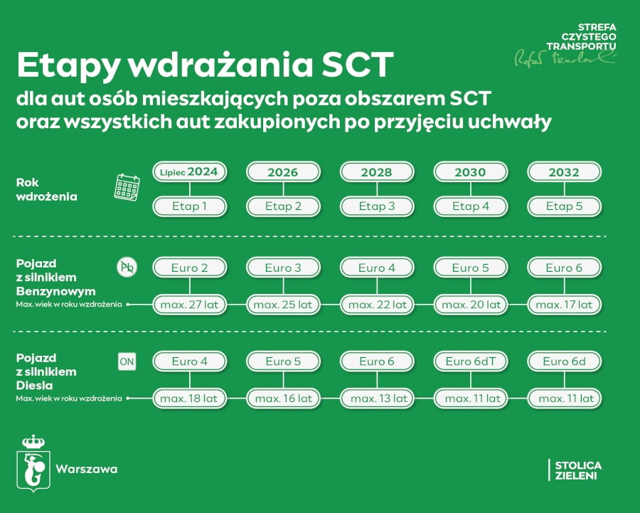 Styczeń 2028. Dopiero wtedy osoby, które teraz mieszkają na terenie strefy i płacące podatki w Warszawie będą objęte nowymi zasadami. To oznacza, że nie będą ich dotyczyć dwa pierwsze etapy wdrażania SCT. Po styczniu 2028 r. mieszkańcy strefy nie będą mogli wjechać tam 13-letnimi Dieslami i 22-letnimi autami benzynowymi – oraz oczywiście starszymi egzemplarzami. Wprowadzone opóźnienie dla mieszkańców mają pomóc im w przystosowaniu się do zmian i dać czas na ewentualną wymianę samochodów na nowsze.