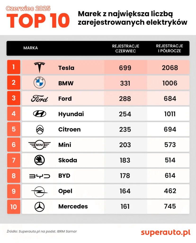 Wiele wskazuje na to, że Tesla wraca na normalne tory sprzedażowe. Analiza Powerdot oraz Superauto.pl. wskazuje, że liczba aut marki zarejestrowanych u nas w czerwcu wyniosła 699, co dało amerykańskiemu producentowi pierwszą pozycję na rynku osobowych elektryków w Polsce. Na drugim miejscu, z liczbą 331 e-samochodów, znalazło się BMW, a na trzecim Ford (288 aut).