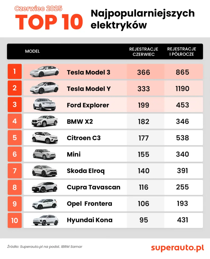 W czerwcu w zestawieniu modelowym wygrała Tesla Model 3, a tuż za nią uplasował się Model Y. Na kolejnych pozycjach uplasowały się elektryczny Ford Explorer, BMW X2, Citroen C3 oraz elektryczne MINI.