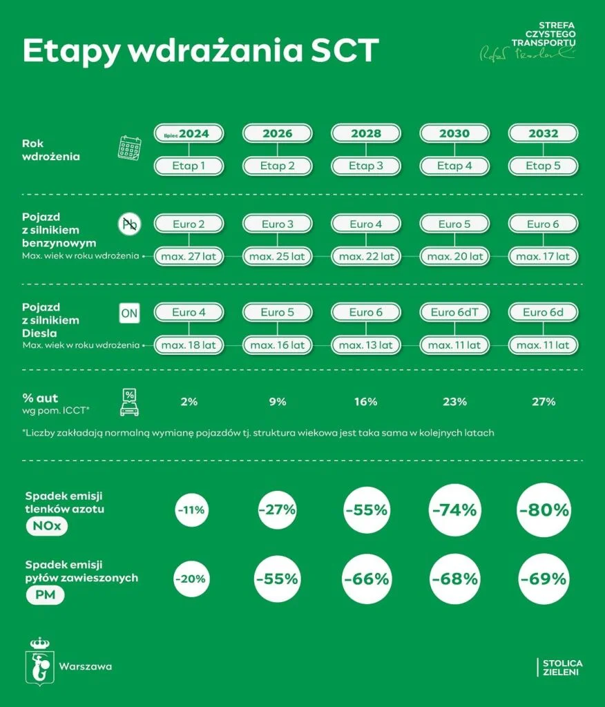 W pierwszym etapie ograniczenie wjazdu do SCT dotyczyłoby pojazdów benzynowych niespełniających normy Euro 2 (starszych niż 27 lat) i pojazdów z silnikiem Diesla niespełniających normy Euro 4 (starszych niż 18 lat). Później, konsekwentnie co dwa lata, zwiększane będą wymagania dotyczące standardów emisji spalin dla aut poruszających się w strefie.