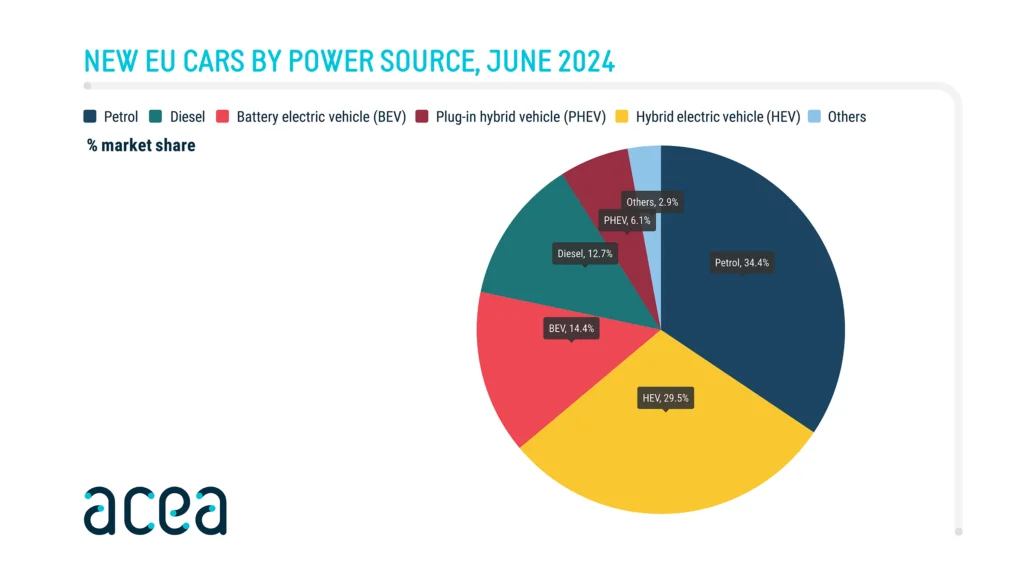W czerwcu samochody akumulatorowo-elektryczne stanowiły 14,4% rynku samochodowego w UE, w porównaniu z 15,1% w roku poprzednim. Jednocześnie pojazdy hybrydowo-elektryczne (HEV) zwiększyły swój udział w rynku, rosnąc z 24,4% do 29,5%. Łączny udział samochodów benzynowych i tych z silnikiem diesla spadł do 47,1% z 49,6%.