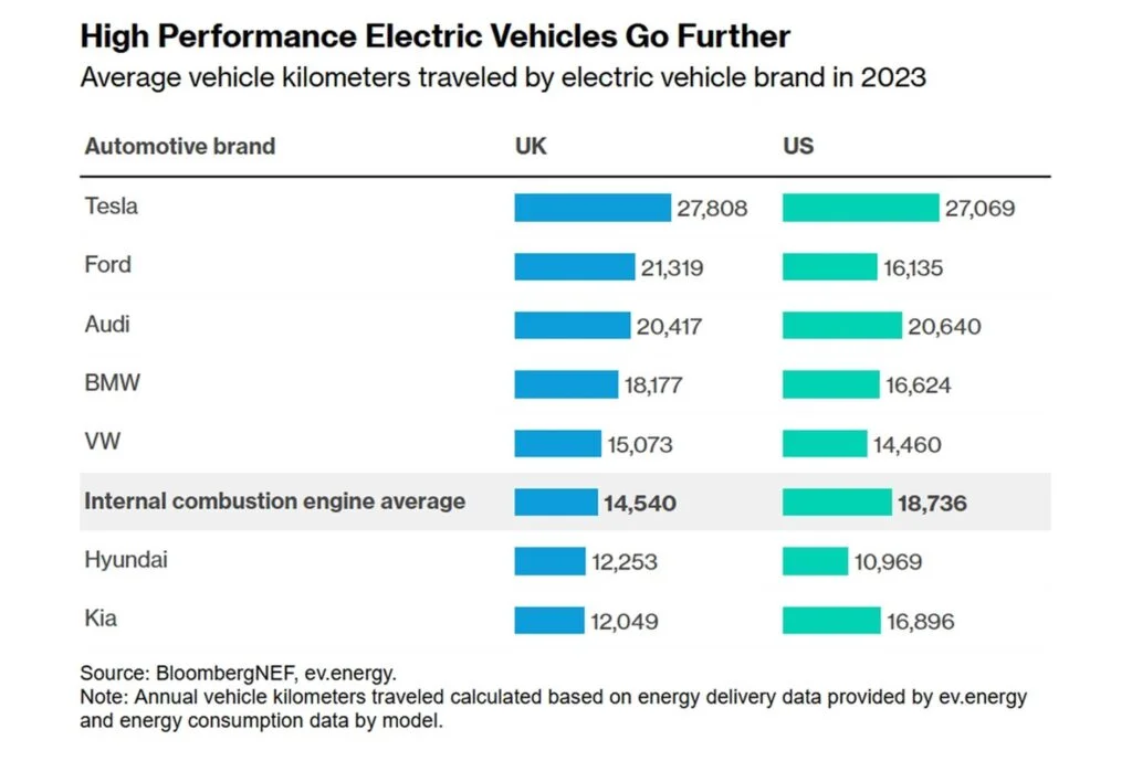 Z badań wynika, że w wielu rozwiniętych gospodarkach właściciele samochodów elektrycznych pokonują średnio rocznie więcej kilometrów niż posiadacze aut spalinowych. W Chinach, różnica wynosi aż 66% na korzyść elektryków, w Niderlandach 56%, a w Norwegii 40%. Nawet w Szwecji, gdzie różnica jest najmniejsza, użytkownicy elektryków pokonują o 15% więcej kilometrów niż właściciele pojazdów z silnikami spalinowymi.
