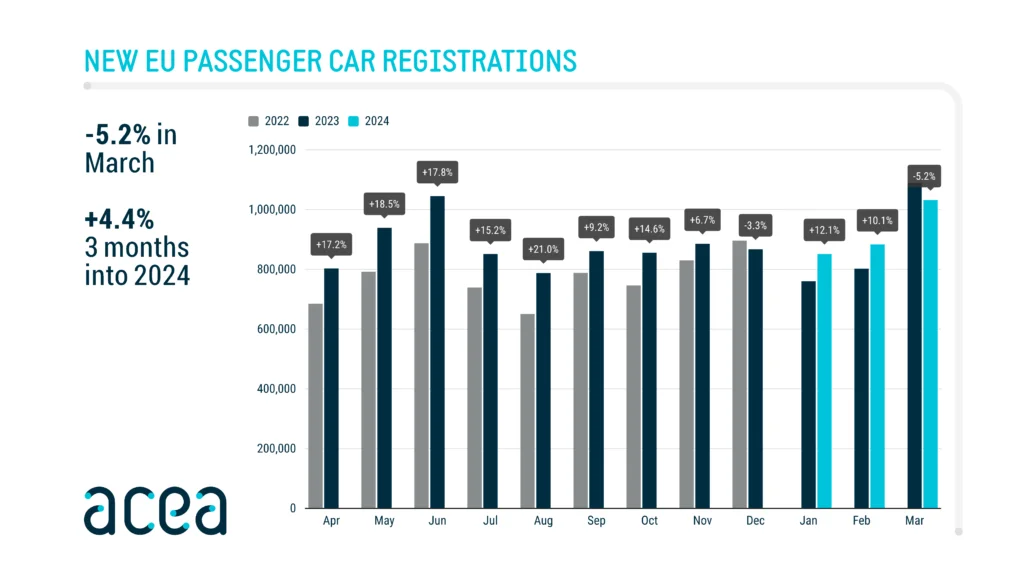 Spadek na rynku diesli był jeszcze bardziej dotkliwy – w marcu wyniósł on 18,5%. Znaczące spadki zanotowano na największych rynkach: Francji (-32,1%), Hiszpanii (-38%) i Włoszech (-27,6%), natomiast Niemcy odnotowały jedynie nieznaczny spadek wynoszący 0,5%. Całkowita sprzedaż samochodów z silnikiem diesla wyniosła 128 227 sztuk, co stanowi udział w rynku na poziomie 12,4%. To oznacza spadek w porównaniu z ubiegłorocznymi 14,4%.