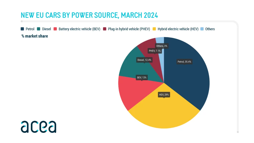 W marcu udział w rynku samochodów elektrycznych spadł do 13% z 13,9% w tym samy okresie roku ubiegłego, podczas gdy udział pojazdów hybrydowych (HEV) wzrósł do 29% z 24,4%. Benzyna i olej napędowy łącznie zdobyły niecałą połowę rynku (47,8% w porównaniu z 51,8% w marcu 2023 r.).