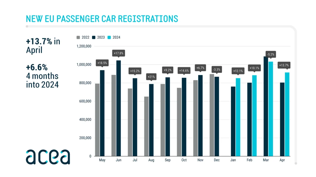 W ciągu pierwszych czterech miesięcy roku liczba rejestracji nowych samochodów w Unii Europejskiej wzrosła o 6,6%, osiągając blisko 3,7 mln sztuk. W tym okresie na największych rynkach regionu odnotowano solidny wzrost, przy czym Niemcy i Hiszpania odnotowały wzrost po 7,8%, a następnie Francja (+7%) i Włochy (+6,1%).